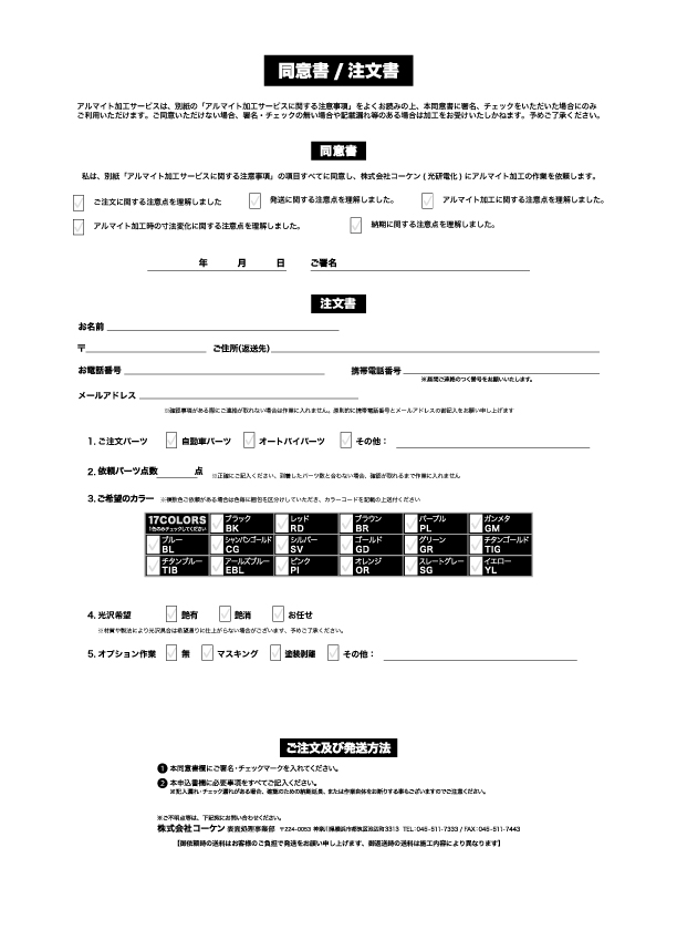 2)の回答メールと左の画像より「アルマイト加工サービスに関する注意事項」をよく読み、2ページ目の同意書/注文書をプリントアウト・ご記入の上、ご同梱下さい。